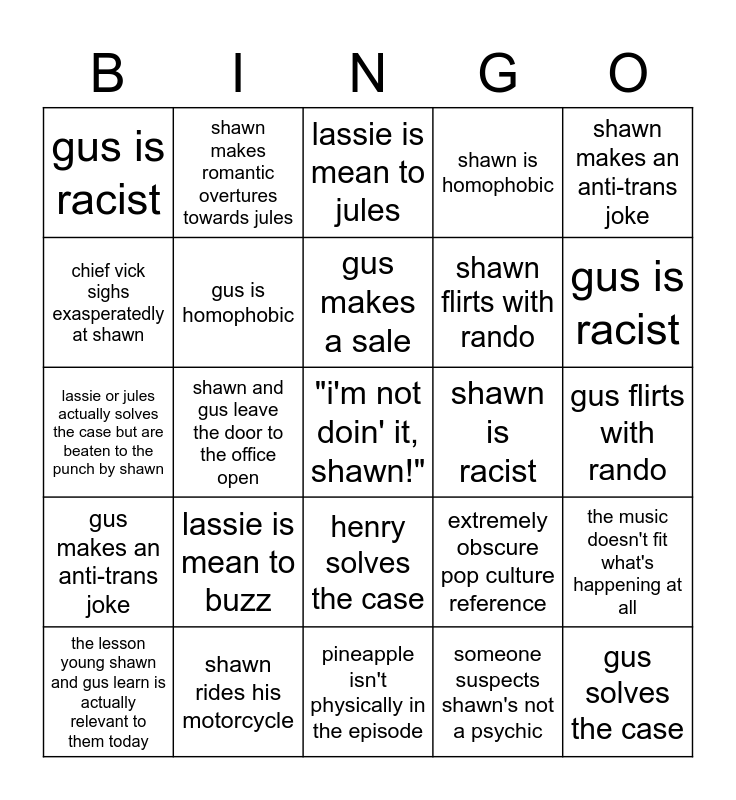 This bingo card has a free space and 24 words: lassie is mean to buzz, shawn rides his motorcycle, gus makes a sale, the lesson young shawn and gus learn is actually relevant to them today, shawn makes an anti-trans joke, gus is racist, chief vick sighs exasperatedly at shawn, shawn makes romantic overtures towards jules, shawn is racist, henry solves the case, shawn flirts with rando, lassie or jules actually solves the case but are beaten to the punch by shawn, extremely obscure pop culture reference, the music doesn't fit what's happening at all, gus is homophobic, someone suspects shawn's not a psychic, gus flirts with rando, lassie is mean to jules, gus is racist, shawn and gus leave the door to the office open, gus solves the case, gus makes an anti-trans joke, shawn is homophobic and pineapple isn't physically in the episode.