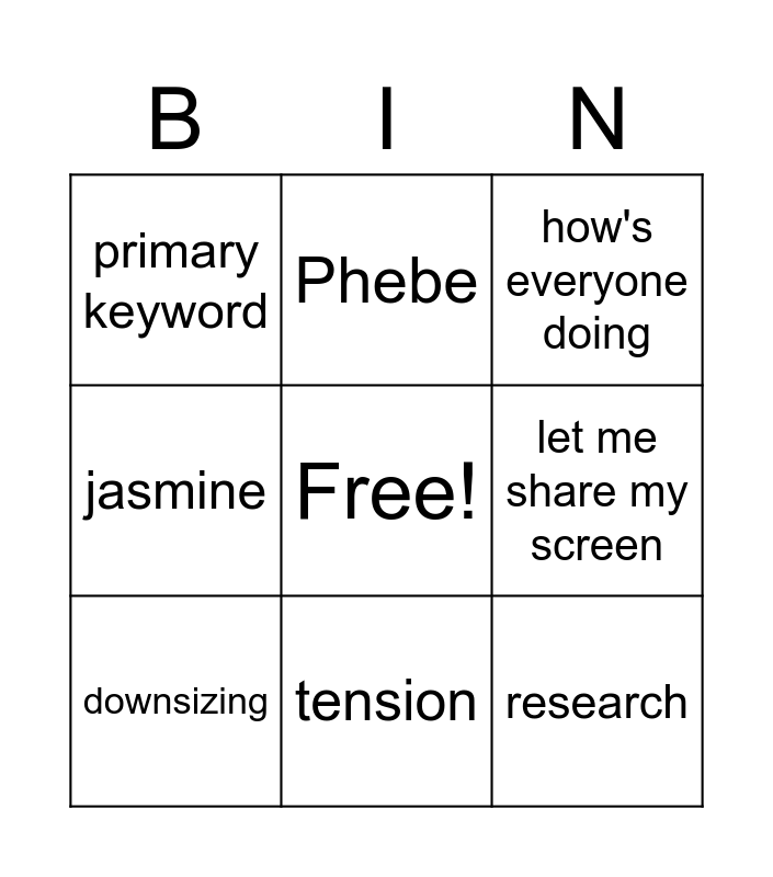 This bingo card has a free space and 8 words: let me share my screen, how's everyone doing, Phebe, downsizing, primary keyword, research, jasmine and tension.