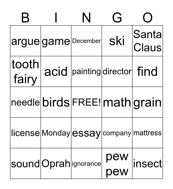 This bingo card has a free space and 24 words: Monday, Oprah, painting, sound, Santa Claus, argue, tooth fairy, game, math, essay, director, needle, company, mattress, acid, pew pew, grain, December, find, birds, insect, license, ski and ignorance.