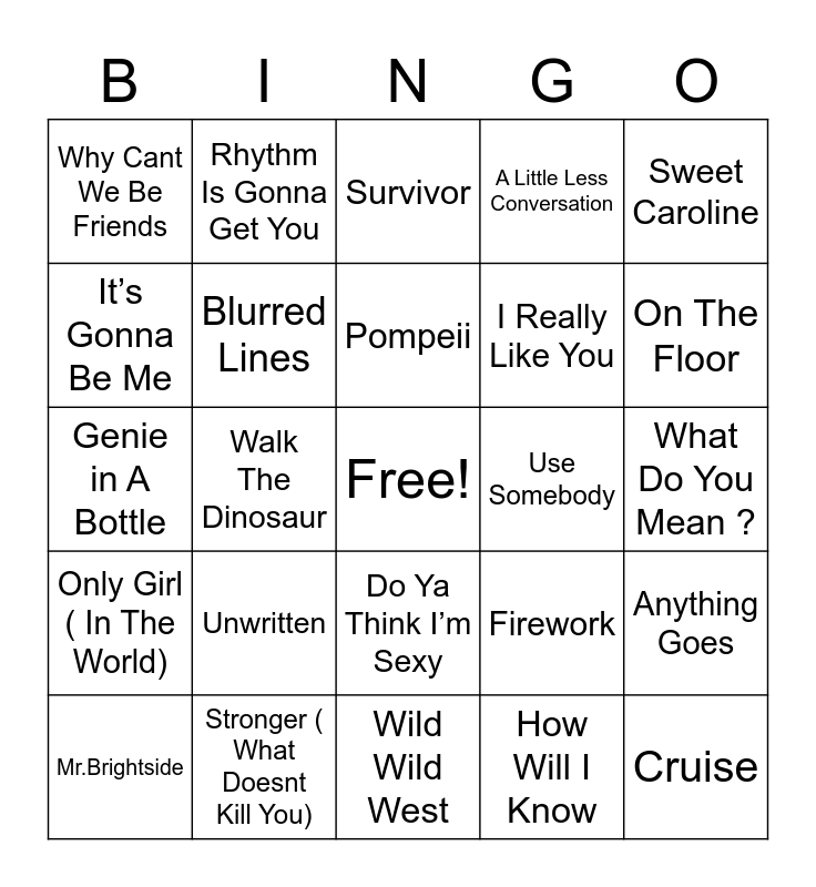 This bingo card has a free space and 70 words: Focus, What Do You Mean ?, 24k Magic, Price Tag, Stronger ( What Doesnt Kill You), Margaritaville, A Little Less Conversation, Cold Heart, Sweet Caroline, Milkshake, Anything Goes, Buddy Holly, Why Cant We Be Friends, Survivor, Weatherman, Walk The Dinosaur, Do Ya Think I’m Sexy, I Really Like You, Love Shack, Only Girl ( In The World), Use Somebody, Firework, On The Floor, Domino, I’m Yours, Wild Ones ( Feat Sia), Shake It Off, Lips Are Movin, How Will I Know, I Knew You Were Trouble, Rhythm Is Gonna Get You, (I’ve Had) The Time Of My Life, Im Still Standing, Ex’s & Oh’s, Manic Monday, Just The Way You Are, Adore You, High Hopes, Wannabe, It’s Gonna Be Me, She Bangs, Unwritten, Cruise, Lets Get Ready To Rhumble, Lip Gloss, Blurred Lines, Mr.Brightside, Dont Go Yet, BREAK MY SOUL, Cowboy Casanova, Country Girl ( SHake It For Me ), Fancy Like, My Life Would Suck Without You, Rock lobster, Wild Wild West, Lollipop, Pompeii, Beautiful Girls, It’s Tricky, Stacy’s Mom, Genie in A Bottle, Bohemian Rhapsody, You Belong With Me, Runaway Baby, I Aint Worried, Say Hey ( I Love You ), Promised Land, Good Golly, Miss Molly, I’ll Be There For You and Rich Girl.