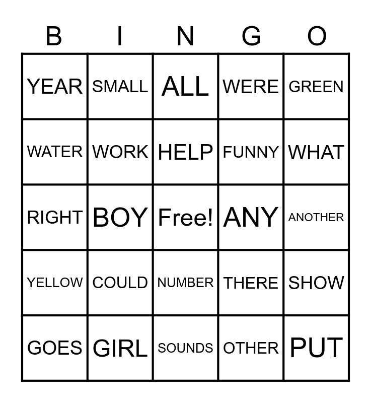 This bingo card has a free space and 24 words: COULD, GIRL, HELP, GOES, GREEN, YEAR, WATER, SMALL, ANY, NUMBER, FUNNY, RIGHT, THERE, SHOW, WORK, OTHER, ANOTHER, ALL, WHAT, BOY, PUT, YELLOW, WERE and SOUNDS.