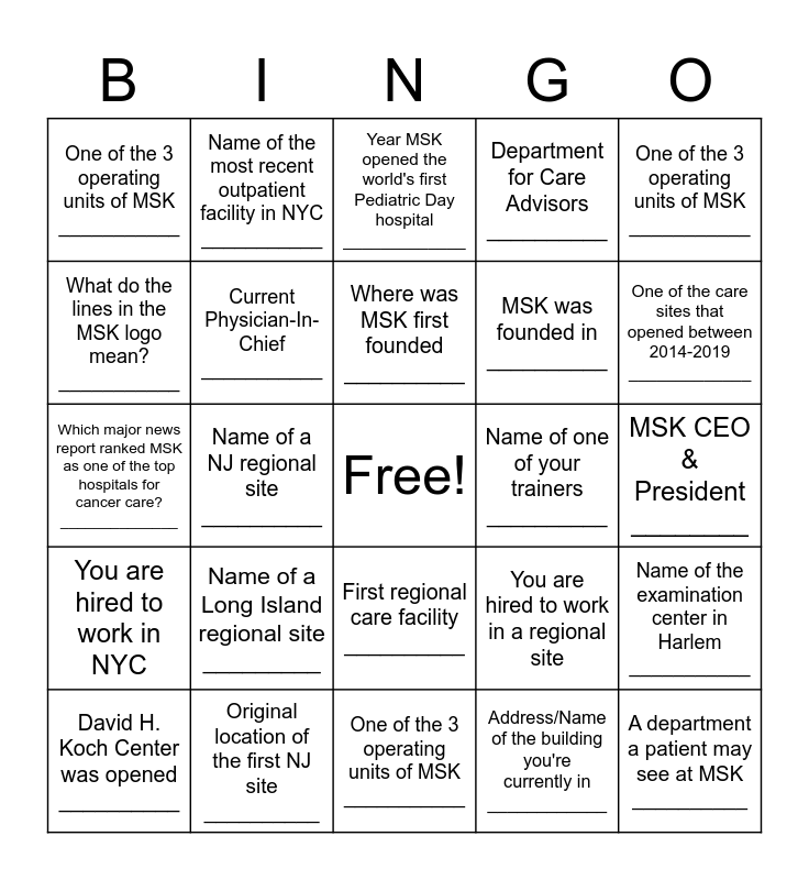 This bingo card has a free space and 24 words: Name of a Long Island regional site _________, Original location of the first NJ site __________, Where was MSK first founded __________, David H. Koch Center was opened __________, One of the 3 operating units of MSK ___________, One of the 3 operating units of MSK ___________, What do the lines in the MSK logo mean? ___________, Name of the most recent outpatient facility in NYC ___________, Name of one of your trainers __________, First regional care facility __________, MSK was founded in __________, Which major news report ranked MSK as one of the top hospitals for cancer care? ______________, You are hired to work in a regional site, Name of the examination center in Harlem ___________, Current Physician-In-Chief ___________, Address/Name of the building you're currently in ____________, MSK CEO & President ________, Year MSK opened the world's first Pediatric Day hospital _____________, One of the care sites that opened between 2014-2019 _____________, Name of a NJ regional site __________, A department a patient may see at MSK __________, You are hired to work in NYC, Department for Care Advisors __________ and One of the 3 operating units of MSK ___________.