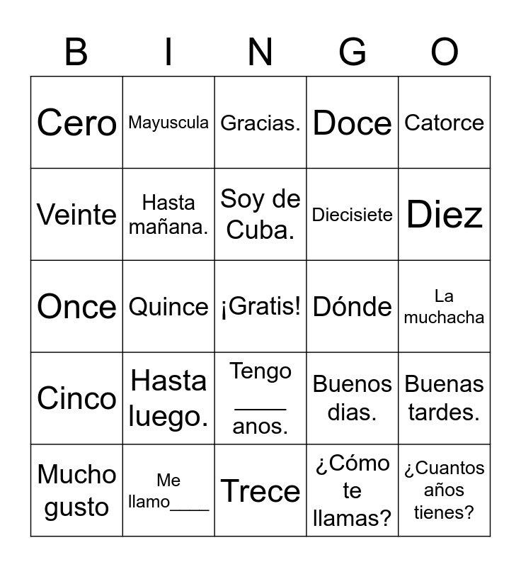 This bingo card has a free space and 24 words: Hasta luego., Me llamo____, Soy de Cuba., Mucho gusto, Catorce, Cero, Veinte, Mayuscula, Dónde, Tengo ____ anos., Diecisiete, Once, Buenos dias., Buenas tardes., Hasta mañana., ¿Cómo te llamas?, La muchacha, Gracias., Diez, Quince, ¿Cuantos años tienes?, Cinco, Doce and Trece.