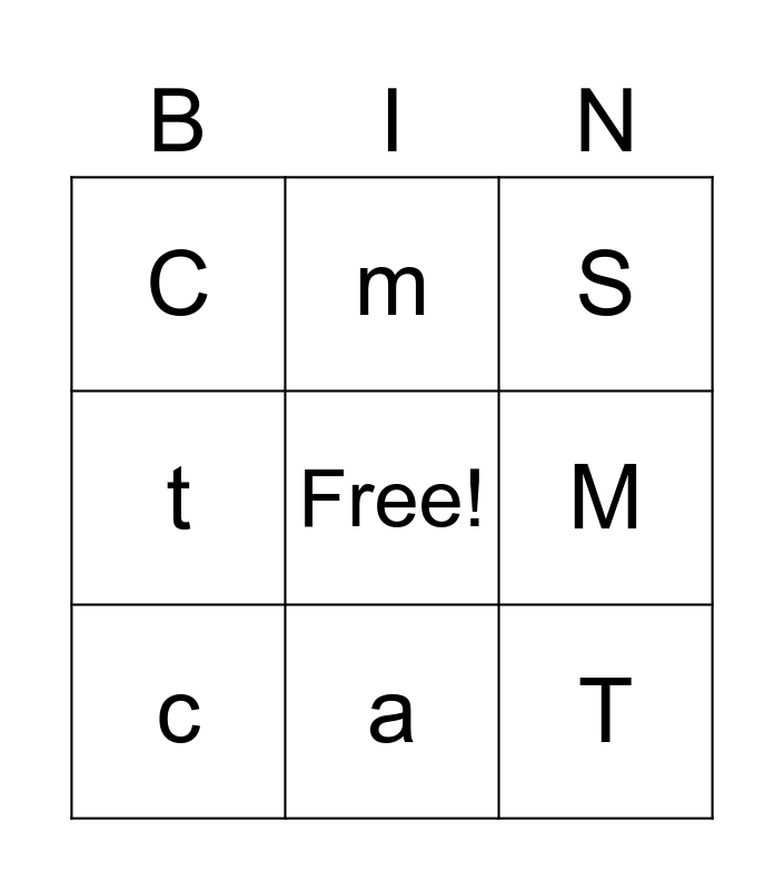 This bingo card has a free space and 13 words: A, B, c, m, t, T, b, D, a, C, M, S and s.