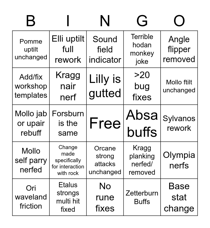 This bingo card has a free space and 32 words: Zetterburn Buffs, Maypul Buffs, Forsburn is the same, Vince doesn’t destroy intangible projectiles, Mollo self parry nerfed, Kragg nair nerf, Angle flipper removed, Olympia nerfs, Elli uptilt full rework, “A little too early”, Lilly is gutted, Sound field indicator, They forgot etalus exists, No workshop character buffs, Absa buffs, Baffling shovel knight change nobody asked for, Ori waveland friction, Mollo jab or upair rebuff, Orcane strong attacks unchanged, Change made specifically for interaction with rock, Kragg planking nerfed/ removed, Missile in hitstun, Sylvanos rework, Etalus strongs multi hit fixed, Base stat change, Terrible hodan monkey joke, >20 bug fixes, Add/fix workshop templates, Pomme uptilt unchanged, No rune fixes, Hodan ftilt unchanged and Mollo ftilt unchanged.