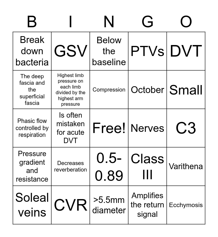 This bingo card has a free space and 29 words: Soleal veins, Compression of the LCIV at the level of the RCIA, Is often mistaken for acute DVT, .5 seconds, Break down bacteria, Below the baseline, Highest limb pressure on each limb divided by the highest arm pressure, Decreases reverberation, Nerves, CVR, C3, Ecchymosis, >5.5mm diameter, Amplifies the return signal, Small, Intima, 0.5-0.89, Pressure gradient and resistance, DVT, Phasic flow controlled by respiration, Class III, Great saphenous vein, October, The deep fascia and the superficial fascia, PTVs, GSV, Varithena, Compression and May-Thurner Syndrome.