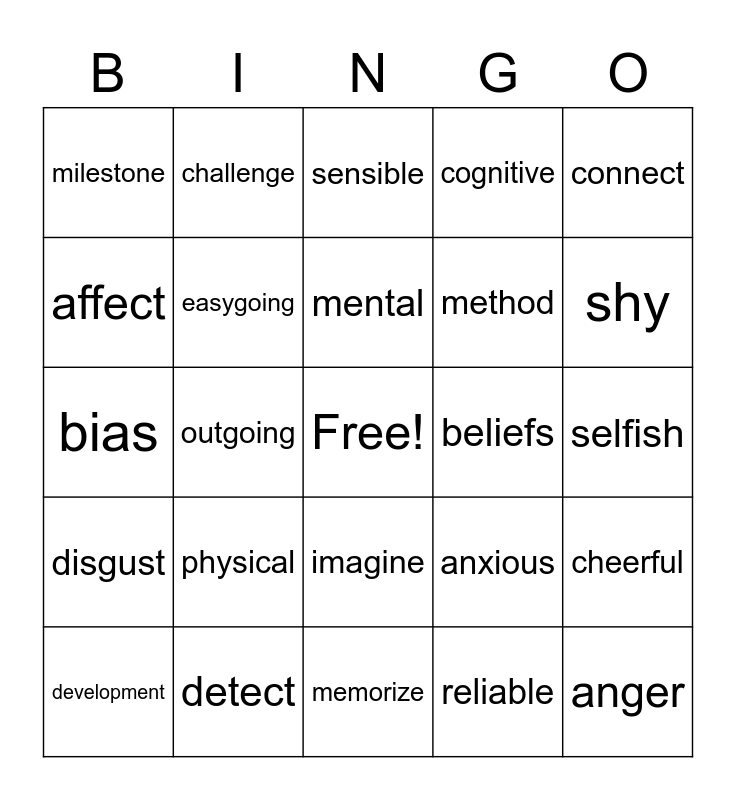 This bingo card has a free space and 24 words: physical, detect, mental, development, connect, milestone, affect, challenge, beliefs, imagine, method, bias, anxious, cheerful, easygoing, reliable, selfish, sensible, shy, outgoing, anger, disgust, cognitive and memorize.