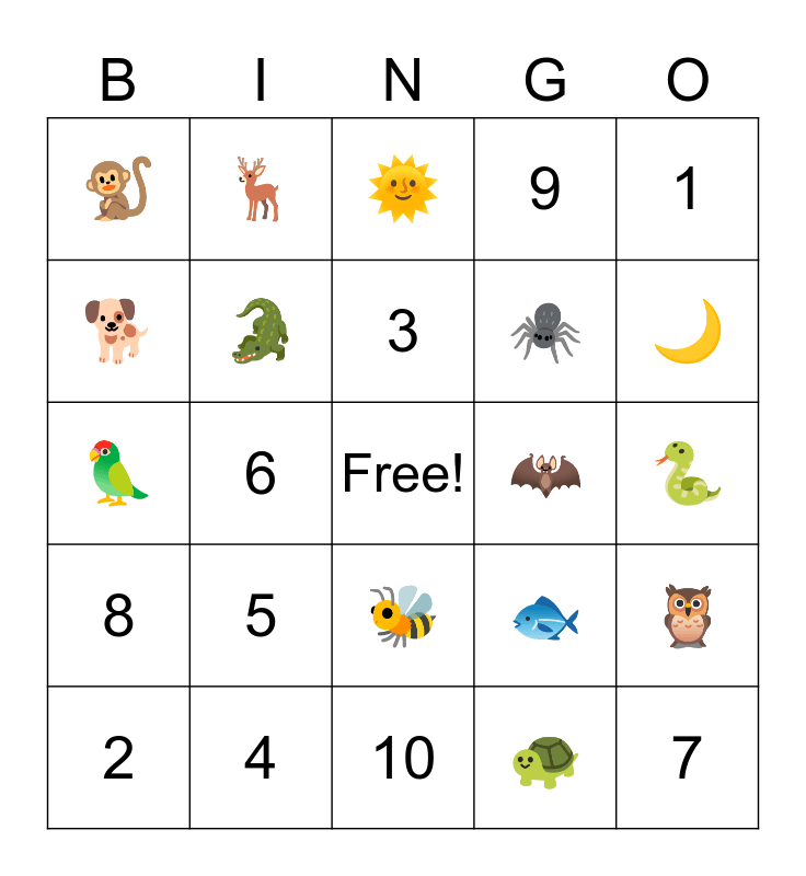 This bingo card has a free space and 24 words: 5, 4, 3, 2, 1, 🐒, 🐕, 🦌, 🦇, 🐝, 🕷️, 🦜, 🐟, 🦉, 🐊, 🐢, 🐍, 🌞, 🌙, 6, 7, 8, 9 and 10.