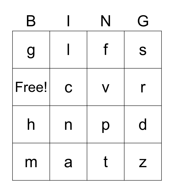 This bingo card has 16 words: a, d, f, g, h, l, p, t, Free!, c, m, s, n, r, v and z.