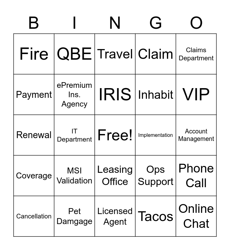 This bingo card has a free space and 54 words: Insurance, Coverage, Renter, Liability, Leasing Office, Work Parties, Claim, Peril, Payment, Reinstatement, Fire, Deposit, Pet Damgage, Cancellation, Declarations Page, Licensed Agent, Online Chat, Inhabit, Customer Service, Account Management, Ops Support, Integrations, Implementation, Claims Department, MSI, QBE, Alacrity, Kemper, Moratorium, Tacos, Bed Bug, Customer Care Emails, White board huddles, Weekly Meetings, Travel, Pay Day, Renewal, Phone Call, Emails, ePremium Ins. Agency, Lightening, Smoke, Non-compliance fee, 3rd party, MSI Validation, Yardi, Client, Interested Party, IRIS, IT Department, VIP, XM, 0806 and 1920.