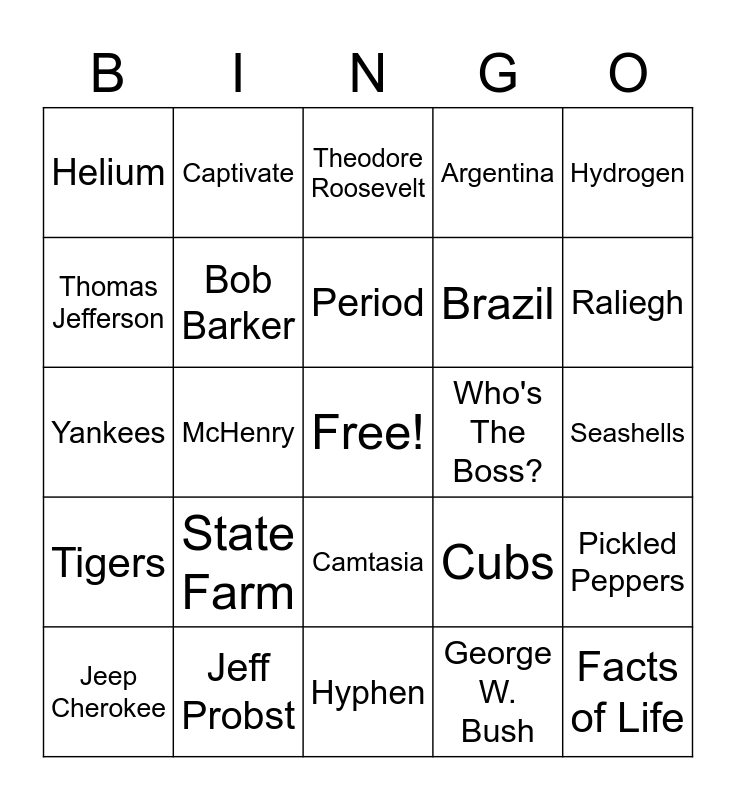 This bingo card has a free space and 24 words: State Farm, Jeff Probst, Period, Jeep Cherokee, Hydrogen, Helium, Thomas Jefferson, Captivate, Who's The Boss?, Camtasia, Brazil, Yankees, Cubs, Pickled Peppers, Bob Barker, George W. Bush, Seashells, Theodore Roosevelt, Raliegh, McHenry, Facts of Life, Tigers, Argentina and Hyphen.