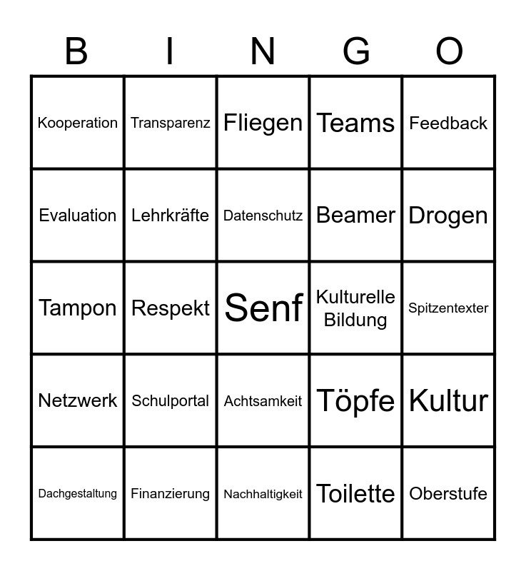 This bingo card has 66 words: Free!, Resilienz, Kommunikation, Kultur, Städel, Rudern, Transparenz, Pädagogischer Tag, Datenschutz, Digitalisierung, Achtsamkeit, Sextaner, Spitzentexter, Feedback, Unterrichtsentwicklung, Evaluation, Respekt, Kooperation, Paradigmenwechsel, Beamer, Schulportal, Netzwerk, Teams, Zusammenarbeit, Arbeitsgemeinschaft, Kompetenz, Internet, Fortbildung, Senf, Professionalisierung, Dachgestaltung, Menstruation, Integration, Impression, Töpfe, Finanzierung, Löwenstark, Tampon, Toilette, Kollegium, Lehrkräfte, Lesung, Kulturelle Bildung, Feueralarm, Schulamt, Kultusministerium, Drogen, Budget, Oberstufe, Pause, Supervision, Mottowoche, Termine, Klausuren, Luftfilter, Heizung, Masken, Kaffeepause, Fliegen, Nachhaltigkeit, SV, Warnwesten, Umwelt, Abstimmung, Zustimmung and Halbjahr.