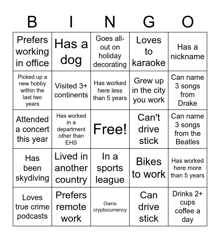 This bingo card has a free space and 25 words: Lived in another country, Owns cryptocurrency, Has worked here less than 5 years, Loves true crime podcasts, Has a nickname, Prefers working in office, Picked up a new hobby within the last two years, Has a dog, Can't drive stick, In a sports league, Grew up in the city you work, Attended a concert this year, Bikes to work, Has worked here more than 5 years, Visited 3+ continents, Ran in a marathon within the last two years, Can name 3 songs from the Beatles, Goes all-out on holiday decorating, Can name 3 songs from Drake, Has worked in a department other than EHS, Drinks 2+ cups coffee a day, Prefers remote work, Has been skydiving, Loves to karaoke and Can drive stick.