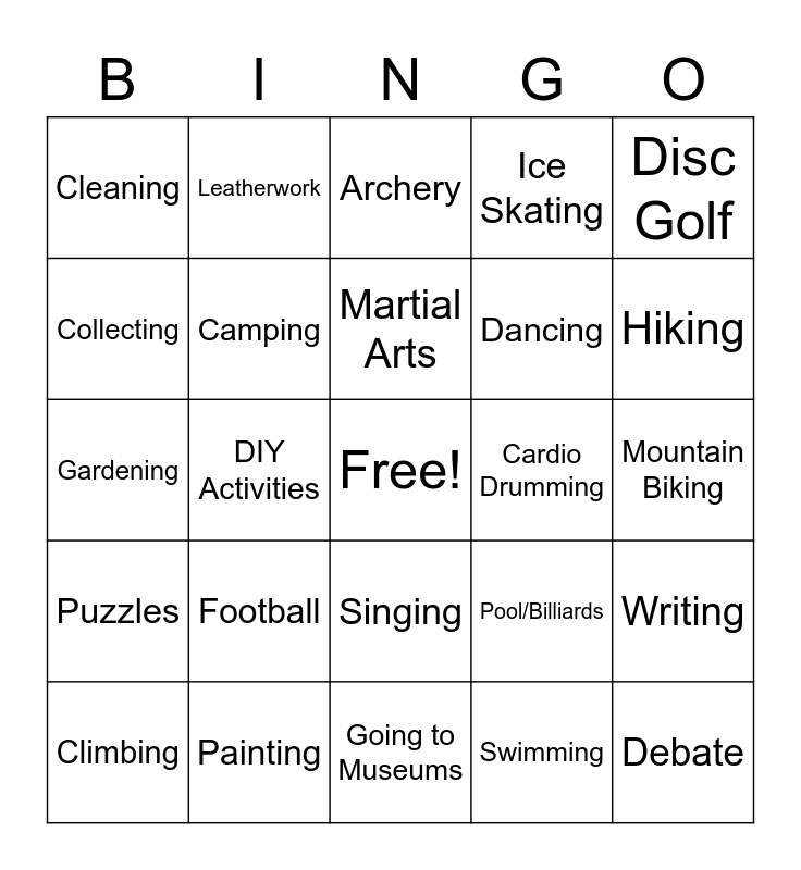 This bingo card has a free space and 82 words: Acting/Improv, Adaptive Sports, Archery, Attending plays, Basketball, Being Outside, Bird Watch, Board Games, Bocci, Bowling, Brain Teasers, Building, Camping, Cardio Drumming, Ceramics, Cleaning, Climbing, Collecting, Cooking/Baking, Crafting, Cycling, Dancing, Debate, Disc Golf, DIY Activities, Drawing, Exercise, Farming, Fishing, Fixing Things, Football, Frisbee, Gardening, Geocaching, Go-Karting, Going to Museums, Going to the Park, Golf, Hiking, Hockey, Horseback Riding, Ice Skating, Knitting, Lawn Games, Learning Languages, Leatherwork, Listening to Music, Martial Arts, Mechanic Work, Meditation, Mini-Golf, Mountain Biking, Painting, Pets/Livestock, Photography, Pickleball, Ping Pong, Playing Cards, Playing Musical Instruments, Pool/Billiards, Pottery, Public Speaking, Puzzles, Reading, Roller skating/Roller blading, Running, Skateboarding, S.T.E.M./ S.T.E.A.M., Story Telling, Sensory Activities, Sewing, Shopping, Singing, Swimming, Tennis, Trampolining, Video Games, Walking, Woodworking/Carpentry, Wrestling, Writing and Yoga/Pilates.