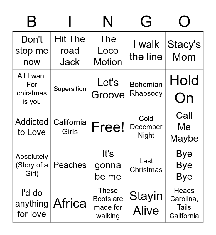 This bingo card has a free space and 89 words: Little Drummer boy, Don't stop Believin, It's gonna be me, Jessie's Girl, Fancy, Silent Night, Drops of Jupiter, I Love Rock N Roll, Poker Face, Dancing Queen, Mambo No 5, Y.M.C.A, Bye Bye Bye, Call Me Maybe, Rock you like a Hurricane, Let's Groove, What's Love Got to Do with it, Material Girl, Drink in my hand, Uptown Funk, Don't rock the jukebox, Achy Breaky Heart, These Boots are made for walking, The Boys are back in town, Addicted to Love, Africa, Runaway, Walkin' After Midnight, Hound Dog, Tequila, I walk the line, California Girls, (I Can't Get no) Satisfaction, Don't stop me now, That's the way (I like it), The Loco Motion, All I want For chirstmas is you, Black or White, Hold On, I'd do anything for love, Absolutely (Story of a Girl), American Pie, Otherside, White Chrismas, Last Christmas, Cold December Night, Tutti Frutti, Jailhouse Rock, Shout, Hit The road Jack, I'm a Believer, Respect, Let It Be, Dream On, Easy on Me, Umbrella, Old Town Road, Shake it Off, Halo, Firework, Sugar, Can't stop the Feeling, Mirrors, Stay with me, Leaving on a Jet Plane, Wannabe, Party in the USA, Footloose, I can see clearly now, Peaches, Heads Carolina, Tails California, Chasin you, Paradise, Bohemian Rhapsody, Supersition, Stayin Alive, Baby got Back, Ice Ice Baby, Cotton Eye Joe, I wanna dance with somebody, Stacy's Mom, We Will Rock you, Vanilla Ice, You Can't Touch This, Under Pressure, Hotel California, We are family, Jump and Boogie Fever.