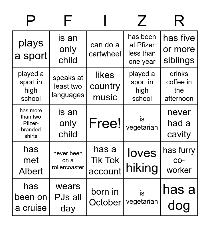 This bingo card has a free space and 53 words: Is lefthanded, has a dog, likes country music, is vegetarian, never been on a rollercoaster, has 5 or more siblings, is an only child, has a tattoo, played a sport in high school, plays a sport, speaks at least two languages, wears PJs all day, has furry co-worker, loves hiking, is lefthanded, has been on a cruise, likes country music, is vegetarian, never been on a rollercoaster, has five or more siblings, is an only child, has a tattoo, played a sport in high school, plays a sport, speaks at least two languages, wears PJs all day, has furry co-worker, loves hiking, loves spicy food, drinks coffee in the afternoon, loves pizza, has never been to NY before this week, plays video games, can juggle, has a child, has been at Pfizer at least 10 years, has been at Pfizer less than one year, born in October, can do a cartwheel, has been a concert in last month, plays a musical instrument, born outside of the USA, never had a cavity, has performed karaoke, has broken a bone, has a Tik Tok account, is not afraid of spiders, has ridden a horse, has more than two Pfizer-branded shirts, has met Albert, has gotten a non-Pfizer covid vaccine, is in a Pfizer office for the first time and been kicked out of a bar.