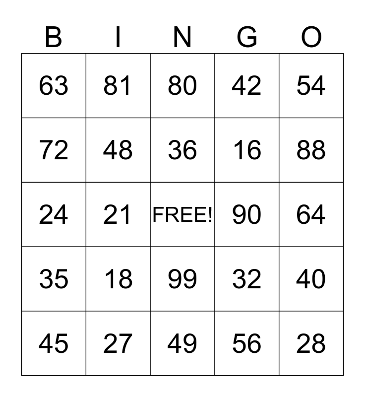 This bingo card has a free space and 24 words: 18, 27, 36, 45, 54, 63, 72, 81, 90, 99, 16, 24, 32, 40, 48, 56, 64, 80, 88, 21, 28, 35, 42 and 49.