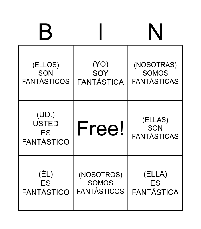 This bingo card has a free space and 13 words: (YO) SOY FANTÁSTICO, (TÚ) ERES FANTÁSTICO, (ÉL) ES FANTÁSTICO, (YO) SOY FANTÁSTICA, (UD.) USTED ES FANTÁSTICO, (ELLA) ES FANTÁSTICA, (TÚ) ERES FANTÁSTICA, (UD.) USTED ES FANTÁSTICA, (NOSOTROS) SOMOS FANTÁSTICOS, (ELLOS) SON FANTÁSTICOS, (ELLAS) SON FANTÁSTICAS, (NOSOTRAS) SOMOS FANTÁSTICAS and (USTEDES) SON FANTÁSTICOS.