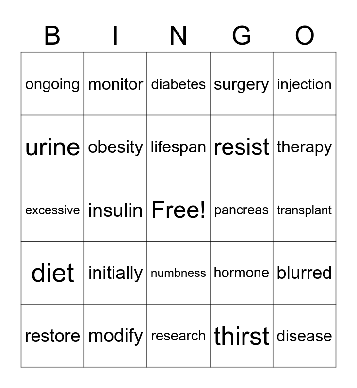 This bingo card has a free space and 24 words: initially, modify, lifespan, restore, injection, ongoing, urine, monitor, pancreas, numbness, resist, excessive, hormone, blurred, obesity, thirst, transplant, diabetes, therapy, insulin, disease, diet, surgery and research.