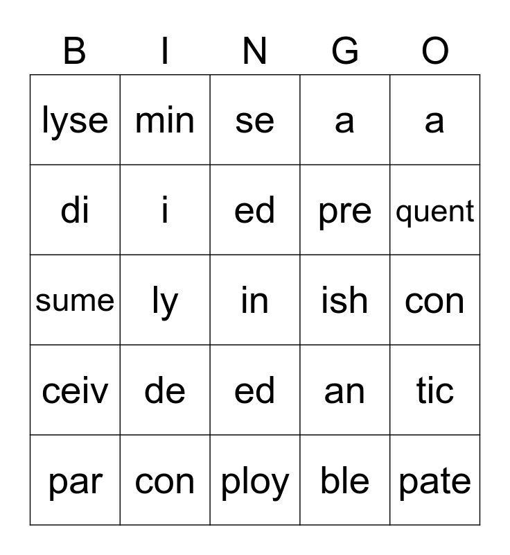 This bingo card has 25 words: de, ploy, ed, par, a, lyse, di, min, ish, ed, pre, sume, an, tic, i, pate, con, se, quent, ly, in, con, ceiv, a and ble.