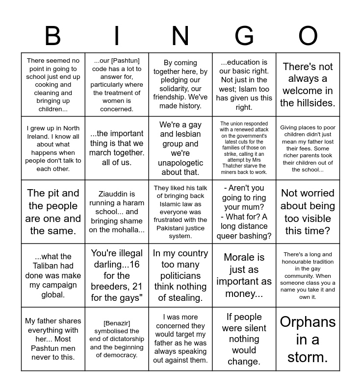 This bingo card has 25 words: You're illegal darling...16 for the breeders, 21 for the gays", I was more concerned they would target my father as he was always speaking out against them., We're a gay and lesbian group and we're unapologetic about that., My father shares everything with her... Most Pashtun men never to this., There's not always a welcome in the hillsides., There seemed no point in going to school just end up cooking and cleaning and bringing up children..., I grew up in North Ireland. I know all about what happens when people don't talk to each other., ...our [Pashtun] code has a lot to answer for, particularly where the treatment of women is concerned., - Aren't you going to ring your mum? - What for? A long distance queer bashing?, In my country too many politicians think nothing of stealing., The union responded with a renewed attack on the government's latest cuts for the families of those on strike, calling it an attempt by Mrs Thatcher starve the miners back to work., The pit and the people are one and the same., Morale is just as important as money..., There's a long and honourable tradition in the gay community. When someone class you a name you take it and own it., ...the important thing is that we march together. all of us., Orphans in a storm., Not worried about being too visible this time?, By coming together here, by pledging our solidarity, our friendship. We've made history., Giving places to poor children didn't just mean my father lost their fees. Some richer parents took their children out of the school..., Ziauddin is running a haram school... and bringing shame on the mohalla..., They liked his talk of bringing back Islamic law as everyone was frustrated with the Pakistani justice system., [Benazir] symbolised the end of dictatorship and the beginning of democracy., ...what the Taliban had done was make my campaign global., ...education is our basic right. Not just in the west; Islam too has given us this right. and If people were silent nothing would change..
