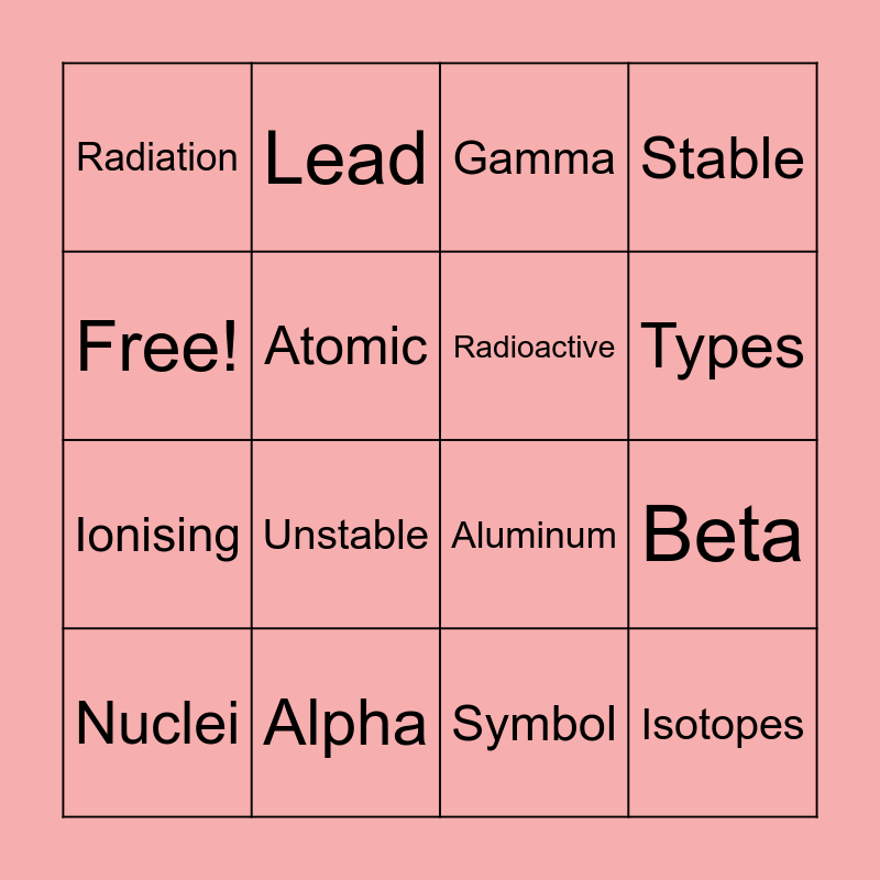 This bingo card has 16 words: Alpha, Beta, Gamma, Radiation, Ionising, Lead, Aluminum, Symbol, Free!, Atomic, Nuclei, Stable, Unstable, Types, Radioactive and Isotopes.