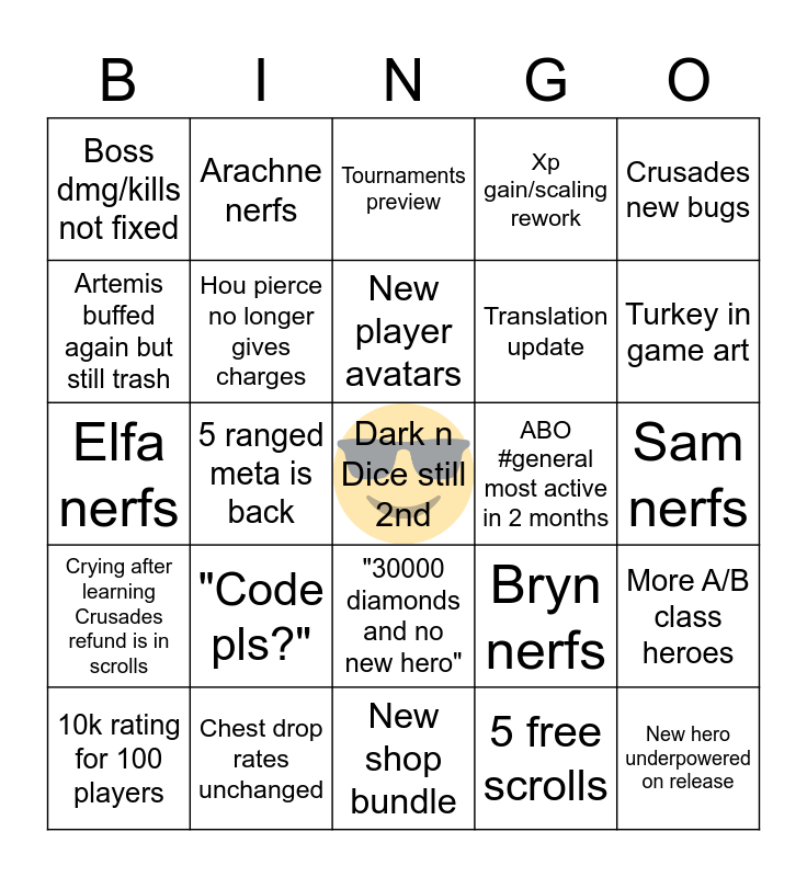 This bingo card has a free space and 24 words: "Code pls?", Chest drop rates unchanged, New player avatars, 10k rating for 100 players, Crusades new bugs, Boss dmg/kills not fixed, Artemis buffed again but still trash, Arachne nerfs, ABO #general most active in 2 months, "30000 diamonds and no new hero", Translation update, Elfa nerfs, Bryn nerfs, More A/B class heroes, Hou pierce no longer gives charges, 5 free scrolls, Sam nerfs, Tournaments preview, Turkey in game art, 5 ranged meta is back, New hero underpowered on release, Crying after learning Crusades refund is in scrolls, Xp gain/scaling rework and New shop bundle.