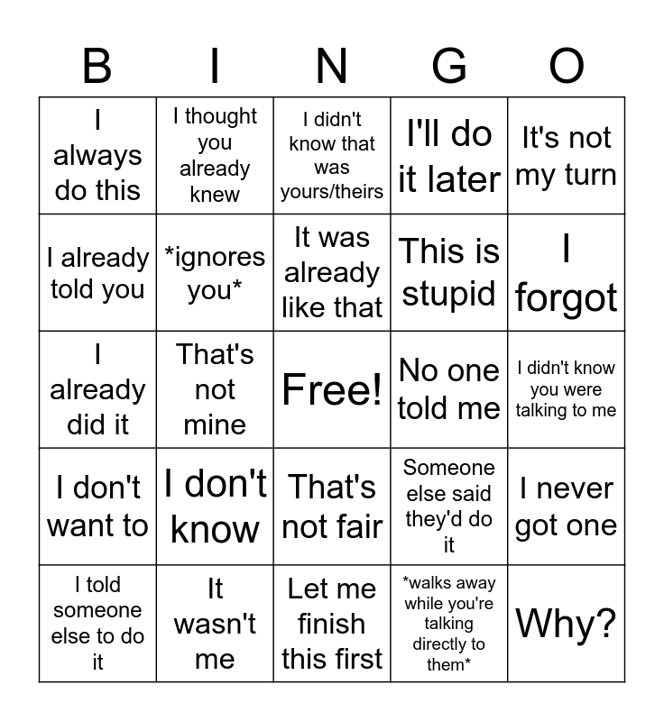 This bingo card has a free space and 24 words: I don't know, It wasn't me, It was already like that, I told someone else to do it, It's not my turn, I always do this, I already told you, I thought you already knew, No one told me, That's not fair, This is stupid, I already did it, Someone else said they'd do it, I never got one, *ignores you*, *walks away while you're talking directly to them*, I didn't know you were talking to me, I didn't know that was yours/theirs, I forgot, That's not mine, Why?, I don't want to, I'll do it later and Let me finish this first.