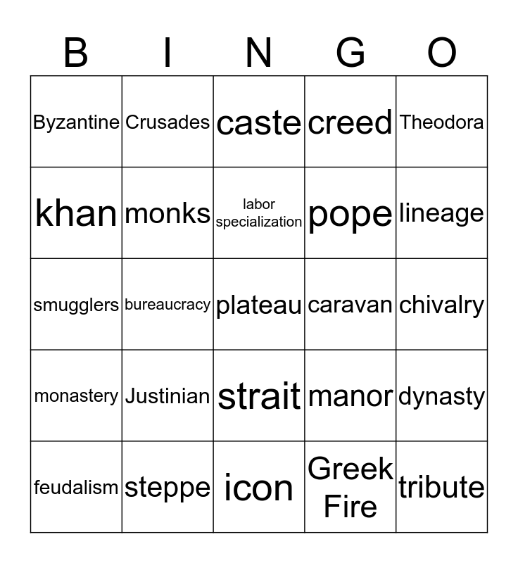 This bingo card has a free space and 24 words: Justinian, steppe, labor specialization, feudalism, Theodora, Byzantine, khan, Crusades, caravan, strait, pope, smugglers, manor, dynasty, monks, Greek Fire, chivalry, caste, lineage, bureaucracy, tribute, monastery, creed and icon.
