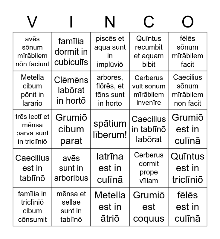 This bingo card has a free space and 27 words: Cerberus dormit prope vīllam, Cerberus audit sōnum mīrābilem, Cerberus vult sonum mīrābilem invenīre, Metella est in ātriō, Metella cibum pōnit in lārāriō, piscēs et aqua sunt in implūviō, famīlia dormit in cubiculīs, Caecilius est in tablīnō, Caecilius in tablīnō labōrat, Quīntus est in triclīniō, trēs lectī et mēnsa parva sunt in triclīniō, Quīntus recumbit et aquam bibit, famīlia in triclīniō cibum cōnsumit, mēnsa et sellae sunt in tablīnō, Caecilius sōnum mīrābilem nōn facit, Clēmēns est in hortō, Clēmēns labōrat in hortō, arborēs, flōrēs, et fōns sunt in hortō, avēs sunt in arboribus, avēs sōnum mīrābilem nōn faciunt, Grumiō est in culīnā, Grumiō est coquus, Grumiō cibum parat, fēlēs est in culīnā, latrīna est in culīnā, fēlēs sōnum mīrābilem facit and umbra nōn est, sed fēlēs.