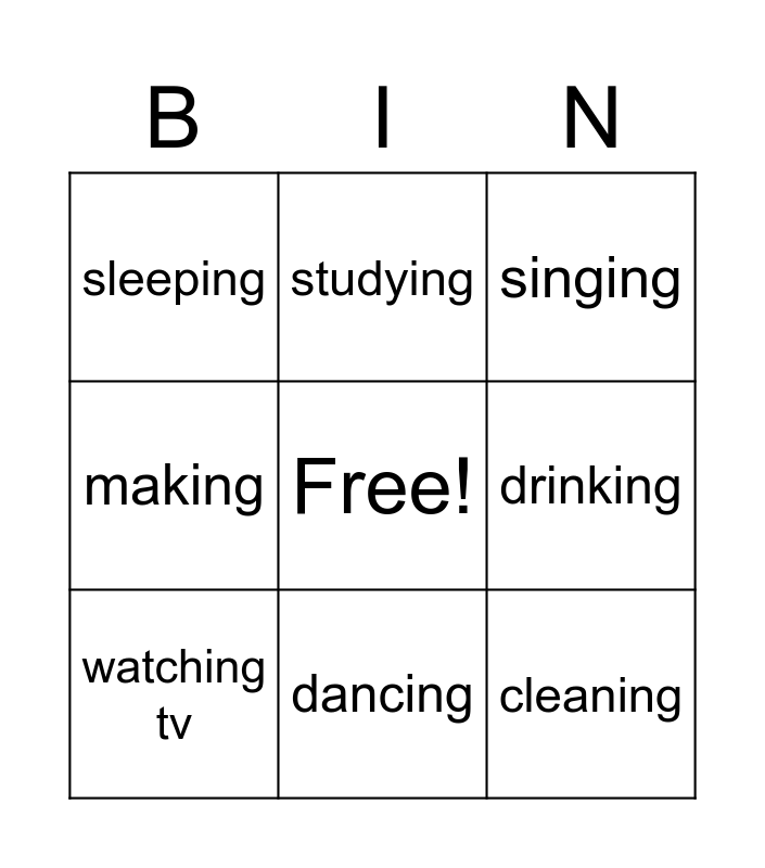 This bingo card has a free space and 10 words: dancing, singing, sleeping, cleaning, making, watching tv, studying, eating, drinking and playing.