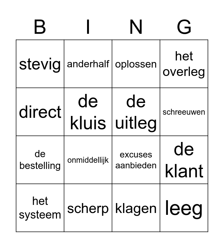 This bingo card has 20 words: de klant, wakker, oplossen, de opleiding, het systeem, direct, scherp, stevig, de bestelling, anderhalf, onmiddellijk, excuses aanbieden, de kluis, leeg, de uitleg, het huwelijk, schreeuwen, het overleg, klagen and het ontbijt.