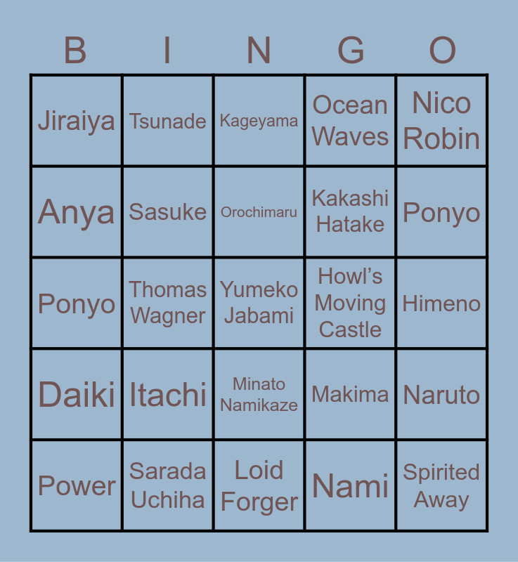 This bingo card has a free space and 24 words: Itachi, Sarada Uchiha, Orochimaru, Power, Nico Robin, Jiraiya, Anya, Tsunade, Howl’s Moving Castle, Minato Namikaze, Kakashi Hatake, Ponyo, Makima, Naruto, Sasuke, Nami, Himeno, Kageyama, Ponyo, Thomas Wagner, Spirited Away, Daiki, Ocean Waves and Loid Forger.