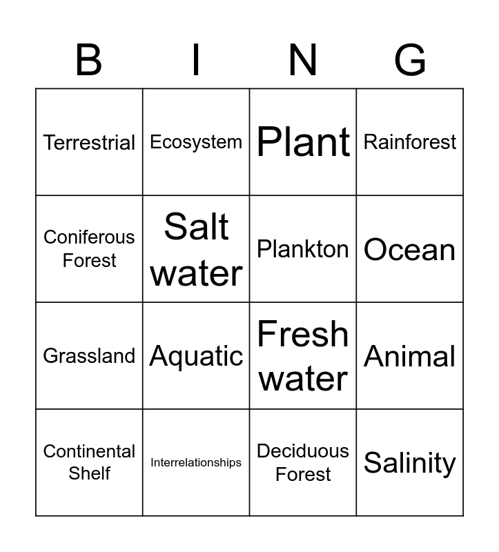 This bingo card has 16 words: Interrelationships, Animal, Plant, Terrestrial, Grassland, Ecosystem, Fresh water, Deciduous Forest, Coniferous Forest, Salt water, Continental Shelf, Rainforest, Aquatic, Ocean, Plankton and Salinity.