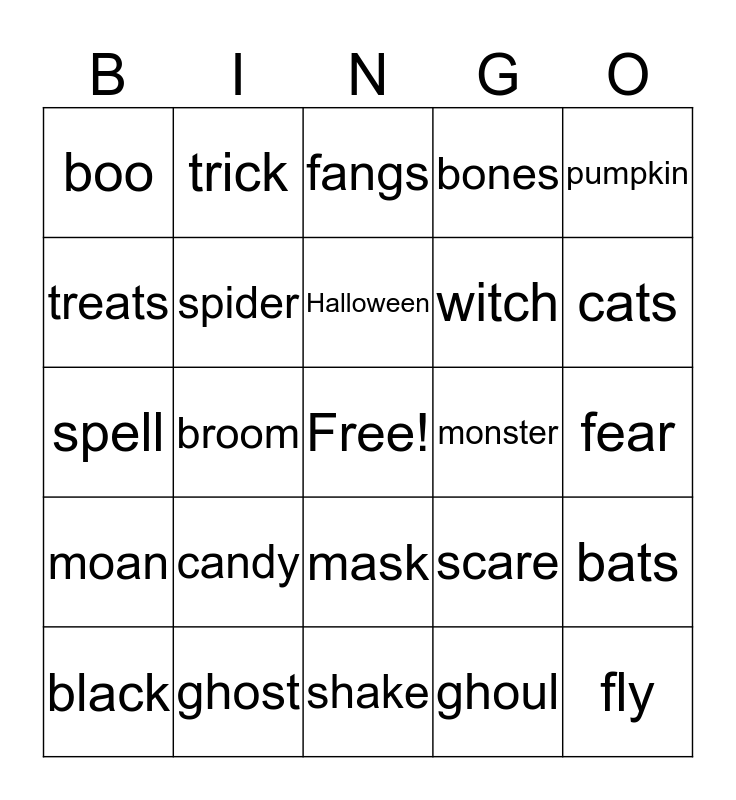 This bingo card has a free space and 24 words: candy, ghost, Halloween, black, pumpkin, boo, treats, trick, monster, mask, witch, spell, scare, bats, spider, ghoul, fear, fangs, cats, broom, fly, moan, bones and shake.