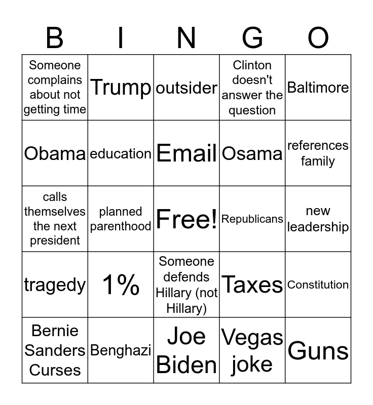 This bingo card has a free space and 24 words: 1%, Benghazi, Email, Bernie Sanders Curses, Baltimore, Someone complains about not getting time, Obama, Trump, Republicans, Someone defends Hillary (not Hillary), Osama, calls themselves the next president, Taxes, Constitution, education, Vegas joke, new leadership, outsider, references family, planned parenthood, Guns, tragedy, Clinton doesn't answer the question and Joe Biden.