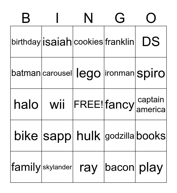 This bingo card has a free space and 24 words: sapp, skylander, lego, family, DS, birthday, batman, isaiah, fancy, hulk, ironman, halo, godzilla, books, carousel, bacon, captain america, cookies, spiro, wii, play, bike, franklin and ray.