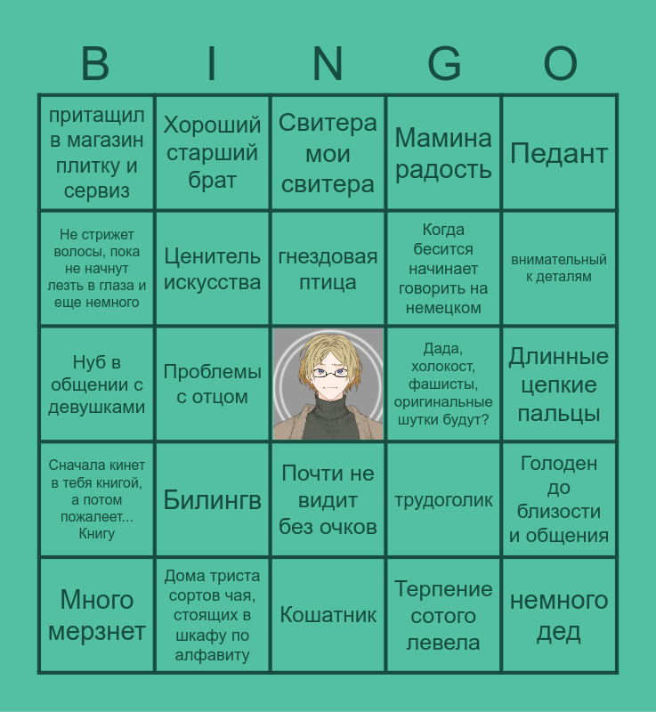 This bingo card has a free space and 24 words: Билингв, Дома триста сортов чая, стоящих в шкафу по алфавиту, гнездовая птица, Много мерзнет, Педант, притащил в магазин плитку и сервиз, Не стрижет волосы, пока не начнут лезть в глаза и еще немного, Хороший старший брат, Дада, холокост, фашисты, оригинальные шутки будут?, Почти не видит без очков, Когда бесится начинает говорить на немецком, Нуб в общении с девушками, трудоголик, Голоден до близости и общения, Ценитель искусства, Терпение сотого левела, Длинные цепкие пальцы, Свитера мои свитера, внимательный к деталям, Проблемы с отцом, немного дед, Сначала кинет в тебя книгой, а потом пожалеет... Книгу, Мамина радость and Кошатник.