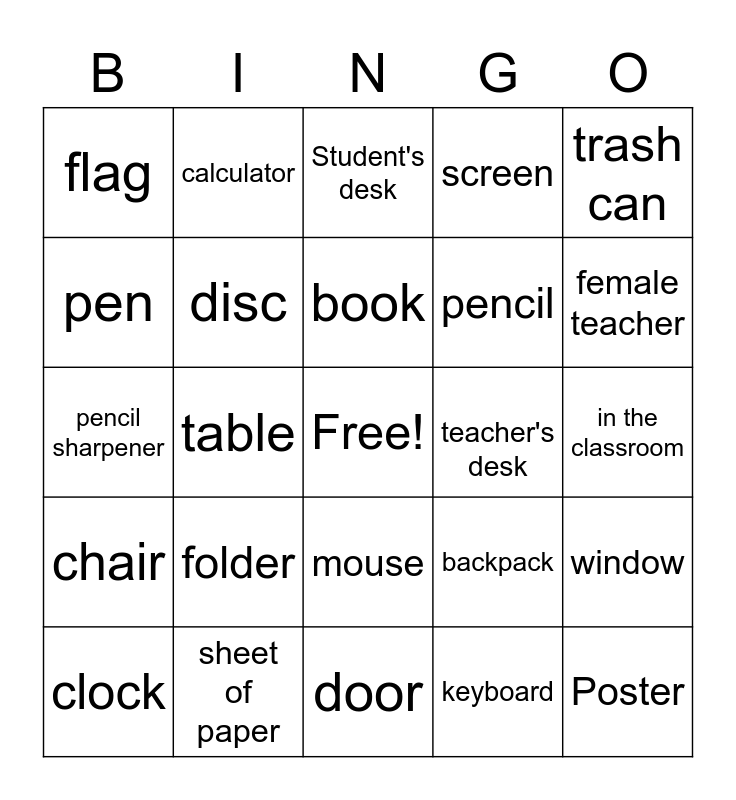 This bingo card has a free space and 24 words: folder, sheet of paper, book, clock, trash can, flag, pen, calculator, teacher's desk, mouse, pencil, pencil sharpener, backpack, window, disc, keyboard, in the classroom, Student's desk, female teacher, table, Poster, chair, screen and door.