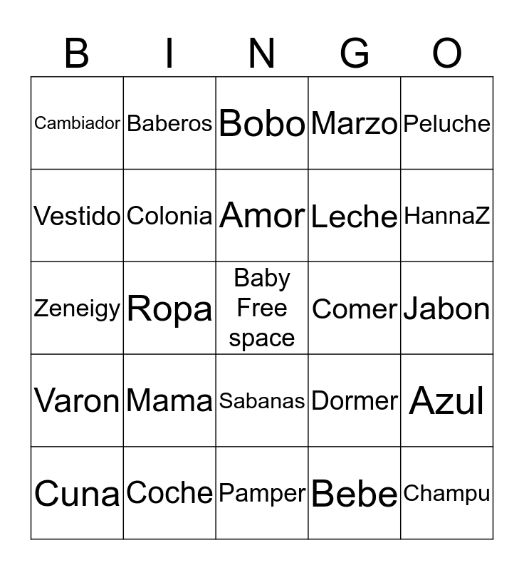 This bingo card has a free space and 24 words: Mama, Coche, Amor, Cuna, Peluche, Cambiador, Vestido, Baberos, Comer, Sabanas, Leche, Zeneigy, Dormer, Azul, Colonia, Bebe, Jabon, Bobo, HannaZ, Ropa, Champu, Varon, Marzo and Pamper.