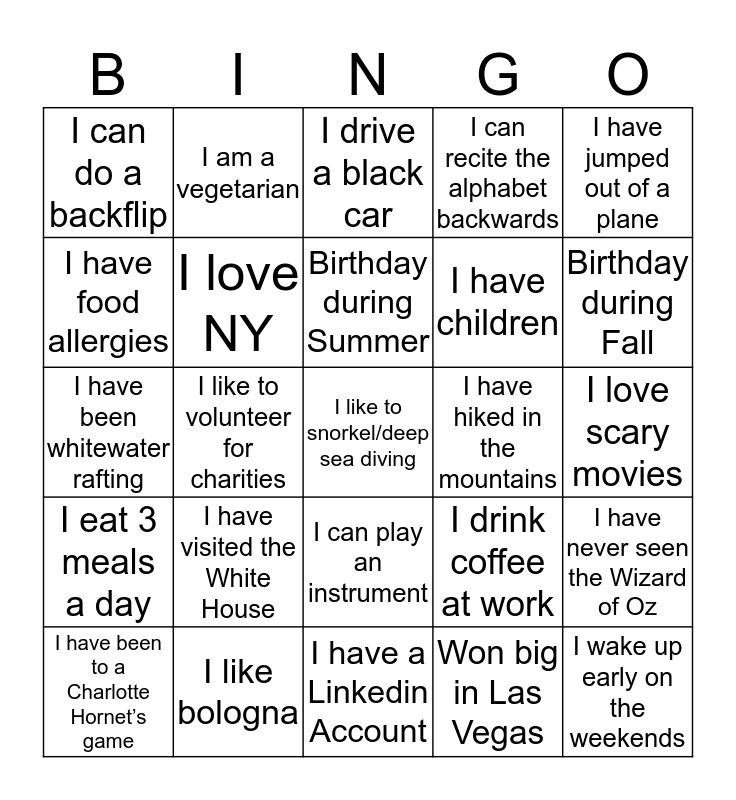 This bingo card has a free space and 24 words: I have visited the White House, I like bologna, Birthday during Summer, I have been to a Charlotte Hornet’s game, I have jumped out of a plane, I can do a backflip, I have food allergies, I am a vegetarian, I have hiked in the mountains, I can play an instrument, I have children, I have been whitewater rafting, I drink coffee at work, I have never seen the Wizard of Oz, I love NY, Won big in Las Vegas, I love scary movies, I drive a black car, Birthday during Fall, I like to volunteer for charities, I wake up early on the weekends, I eat 3 meals a day, I can recite the alphabet backwards and I have a Linkedin Account.