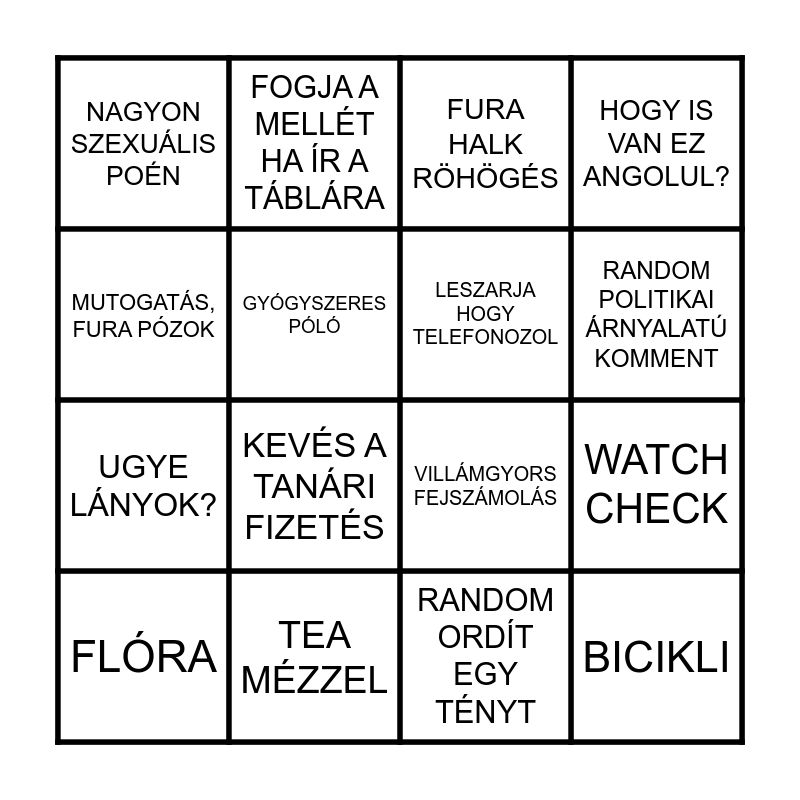 This bingo card has 16 words: TEA MÉZZEL, WATCH CHECK, FURA HALK RÖHÖGÉS, NAGYON SZEXUÁLIS POÉN, UGYE LÁNYOK?, FOGJA A MELLÉT HA ÍR A TÁBLÁRA, VILLÁMGYORS FEJSZÁMOLÁS, RANDOM ORDÍT EGY TÉNYT, MUTOGATÁS, FURA PÓZOK, GYÓGYSZERES PÓLÓ, FLÓRA, HOGY IS VAN EZ ANGOLUL?, KEVÉS A TANÁRI FIZETÉS, RANDOM POLITIKAI ÁRNYALATÚ KOMMENT, LESZARJA HOGY TELEFONOZOL and BICIKLI.