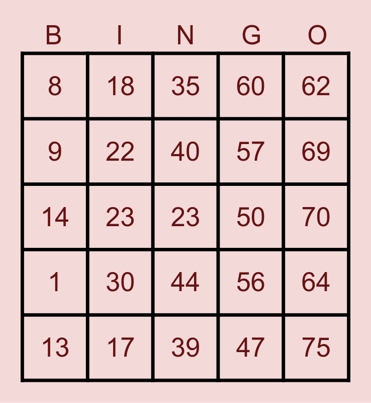 This bingo card has 25 words: 1, 17, 23, 47, 62, 8, 18, 35, 50, 64, 9, 22, 39, 56, 69, 13, 23, 40, 57, 70, 14, 30, 44, 60 and 75.