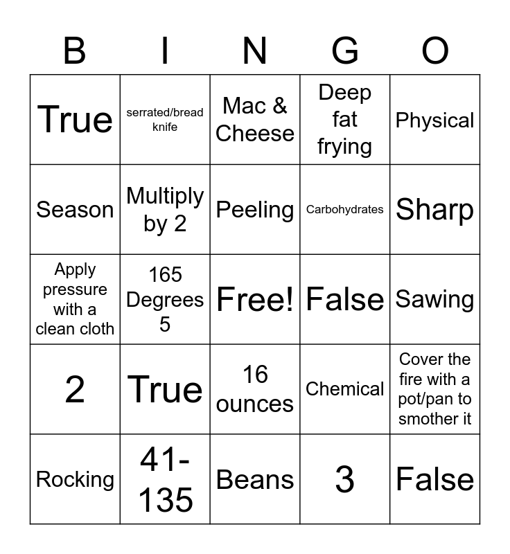This bingo card has a free space and 24 words: True, 41-135, Peeling, Rocking, Physical, True, Season, serrated/bread knife, False, 16 ounces, Carbohydrates, Apply pressure with a clean cloth, Chemical, Cover the fire with a pot/pan to smother it, Multiply by 2, 3, Sawing, Mac & Cheese, Sharp, 165 Degrees 5, False, 2, Deep fat frying and Beans.