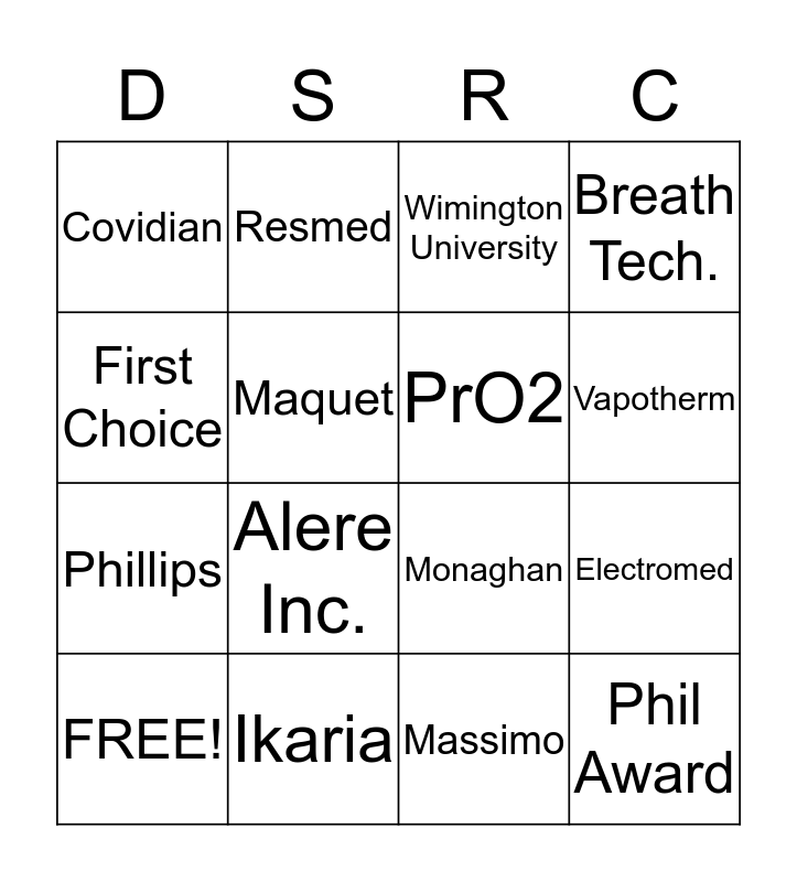This bingo card has 16 words: Ikaria, Electromed, Wimington University, Covidian, Phillips, Resmed, Monaghan, Massimo, First Choice, Maquet, FREE!, Breath Tech., Alere Inc., Vapotherm, PrO2 and Phil Award.