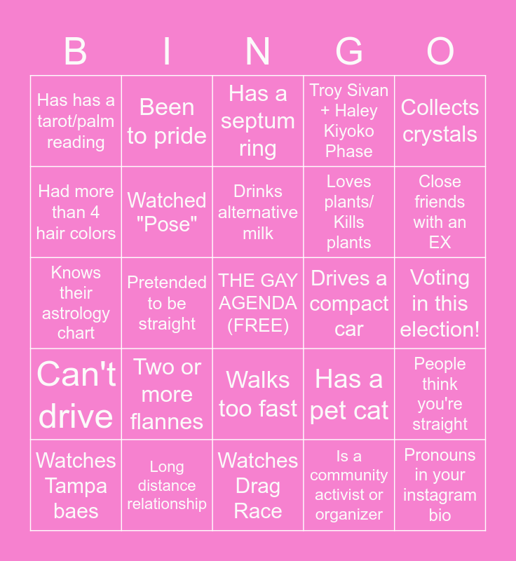 This bingo card has a free space and 24 words: Two or more flannes, Long distance relationship, Drinks alternative milk, Watches Tampa baes, Collects crystals, Has has a tarot/palm reading, Had more than 4 hair colors, Been to pride, Drives a compact car, Walks too fast, Loves plants/ Kills plants, Knows their astrology chart, Has a pet cat, People think you're straight, Watched "Pose", Is a community activist or organizer, Voting in this election!, Has a septum ring, Close friends with an EX, Pretended to be straight, Pronouns in your instagram bio, Can't drive, Troy Sivan + Haley Kiyoko Phase and Watches Drag Race.