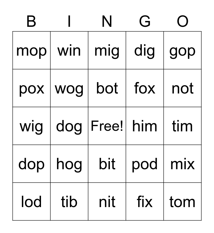 This bingo card has a free space and 40 words: pig, wig, pog, wog, tib, bit, bot, tob, gop, dop, dog, dig, tom, tim, him, hog, mob, mop, min, mig, mix, fix, fox, pox, nox, nix, fit, fim, fid, sid, sod, lod, lid, pod, not, nit, kit, cob, win and wiz.
