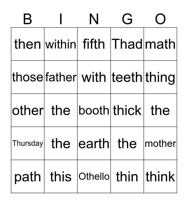 This bingo card has a free space and 24 words: the, this, with, path, math, then, those, within, thick, earth, teeth, other, the, mother, father, thin, the, fifth, thing, the, think, Thursday, Thad and Othello.