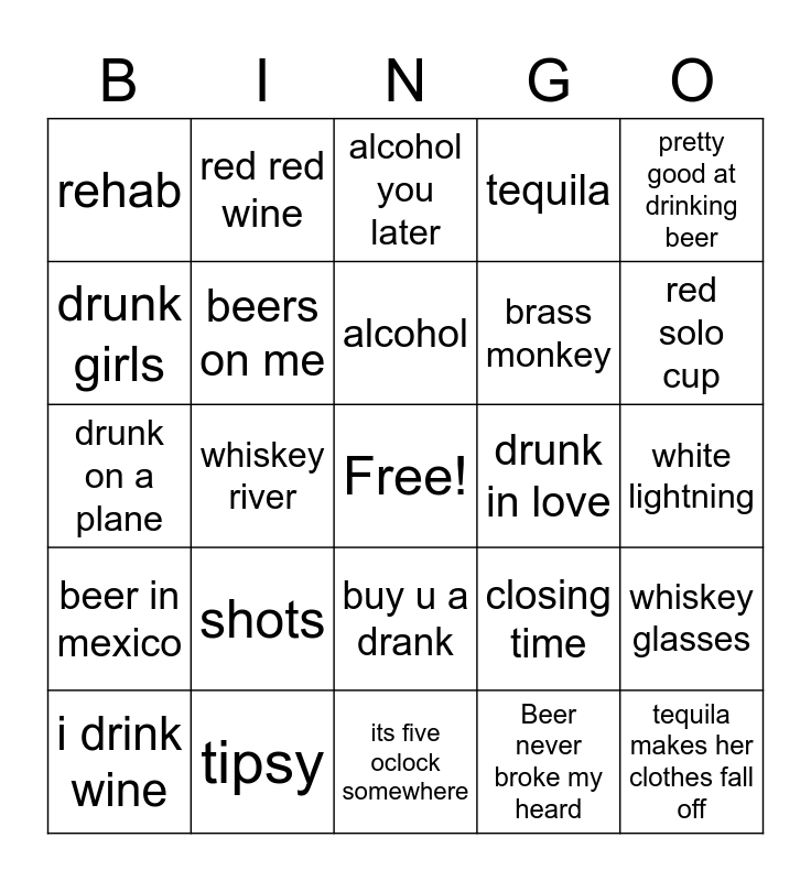 This bingo card has a free space and 34 words: beer, Beer never broke my heard, beer dont, drink a beer, beer in mexico, beers on me, pretty good at drinking beer, i drink wine, red red wine, spill the wine, alcohol, alcohol you later, gin and juice, cheers, drunk in love, red solo cup, tipsy, drunk on a plane, shots, closing time, buy u a drank, have a drink on me, rehab, white lightning, its five oclock somewhere, tequila makes her clothes fall off, tequila, have another drink, brass monkey, drunk girls, friends in low places, whiskey river, whiskey glasses and whiskey in the jar.
