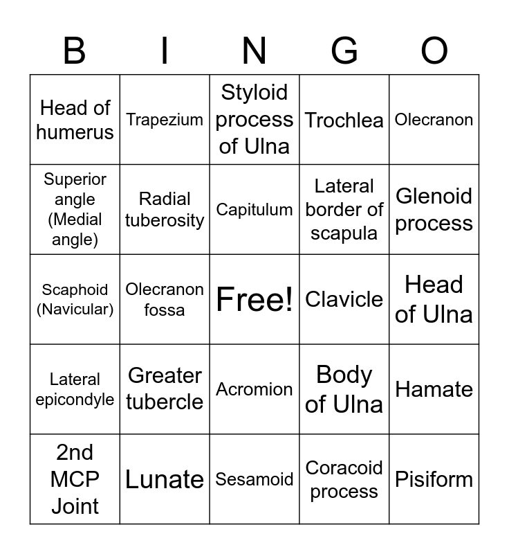 This bingo card has a free space and 36 words: Medial epicondyle, Coranoid fossa, Neck of Radius, Radial tuberosity, Body of Ulna, Lateral epicondyle, Capitulum, Head of Radius, Olecranon, Trochlear notch, Olecranon fossa, Trochlea, Coronoid process, Clavicle, Glenoid process, Head of humerus, Anatomical neck, Greater tubercle, Pisiform, Styloid process of Ulna, Head of Ulna, Hamate, Lunate, 2nd MCP Joint, Sesamoid, Trapezium, Scaphoid (Navicular), Styloid process of Radius, Lateral border of scapula, Superior angle (Medial angle), Spine of scapula, AC Joint, Coracoid process, Acromion, Body of humerus and Body of scapula.